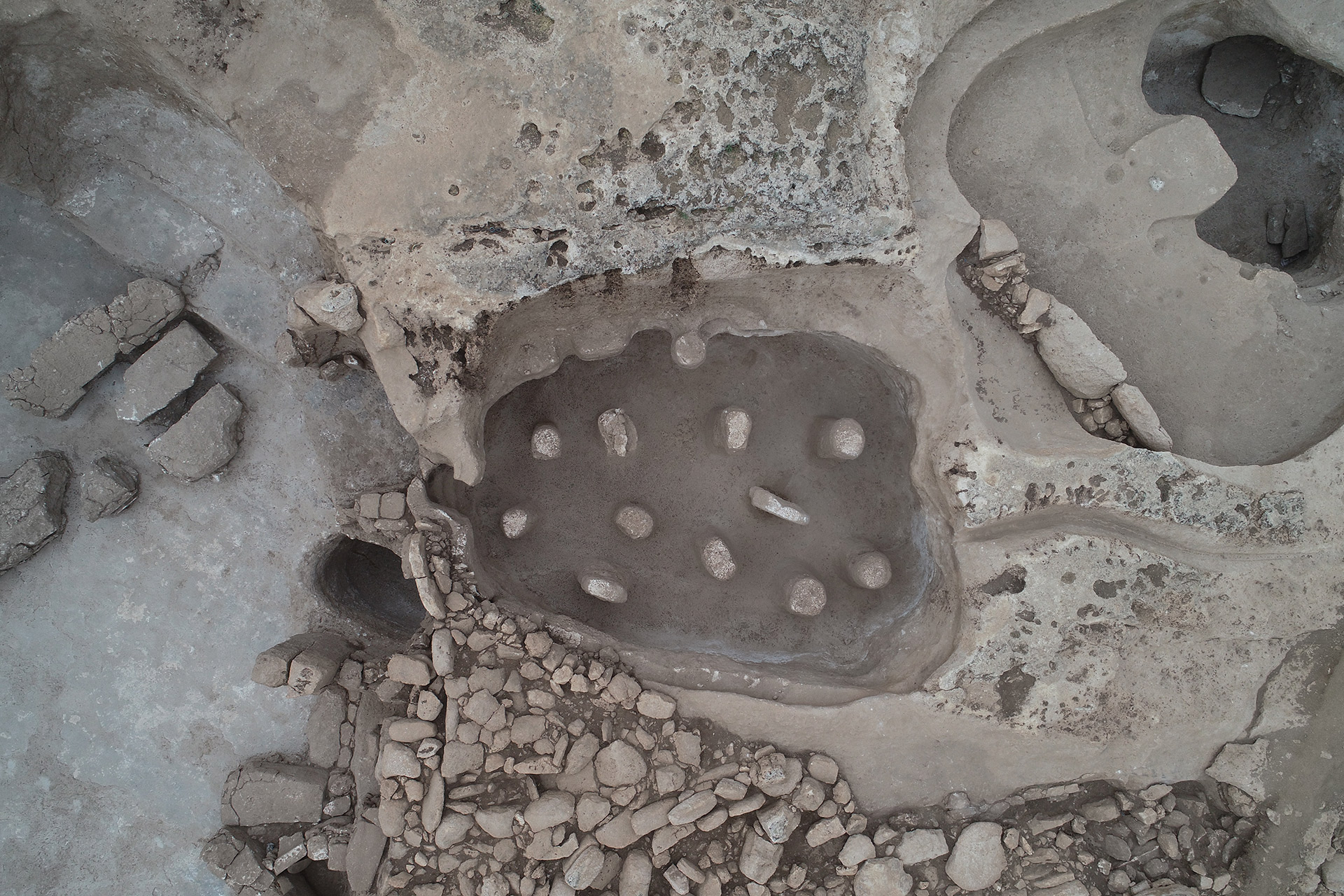 Karahan Tepe’s occupation spans approximately 10,000 to 9,500 BCE, aligning with the Pre-Pottery Neolithic A (PPNA) and extending into the early Pre-Pottery Neolithic B (PPNB). This timeframe positions the site as one of the earliest documented examples of monumental construction by hunter-gatherer communities in Upper Mesopotamia, reflecting a pivotal transition from mobile foraging to more sedentary patterns. Radiocarbon dating of organic remains, such as charred plant materials and animal bones recovered from stratigraphic contexts, has established this broad chronology, with calibrated dates clustering around the late 11th millennium BCE. The site’s developmental sequence indicates phased construction during the early PPNA, marked by the erection of simple enclosures and bedrock-cut features that served as foundational elements. These initial structures, often circular or rectangular in plan, were built using locally quarried limestone T-shaped pillars and walls, suggesting organized labor by small groups. Subsequent phases involved expansions, including the addition of interconnected rooms and symbolic installations, as well as periodic repairs to weathered components, evidenced by multiple fill layers and rebuilding episodes in the stratigraphic record. Such layering reveals intentional deposition of debris and soil, possibly for ritual closure or maintenance, spanning several centuries of intermittent use. This phased evolution is corroborated by radiocarbon assays from the Taş Tepeler network of sites, where Karahan Tepe’s dates overlap with those from nearby settlements like Göbekli Tepe and Sefer Tepe, indicating a shared regional timeline. Organic samples from fill deposits and associated hearths yield consistent results supporting the PPNA onset, while later PPNB traces appear in upper layers with refined lithic tools. Potentially predating Göbekli Tepe’s primary enclosures by up to a few centuries, Karahan Tepe underscores the networked character of early Neolithic innovation across the Şanlıurfa plain.