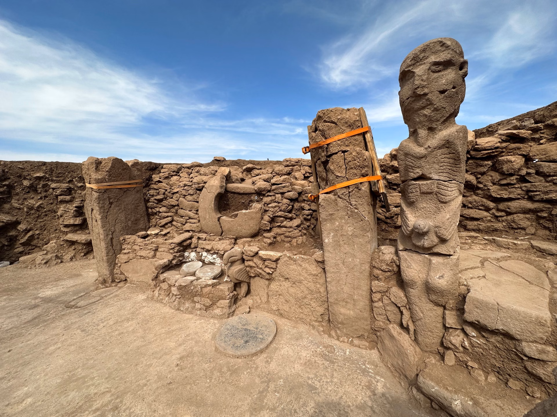 Excavations at Karahan Tepe have revealed a collection of three-dimensional sculptures and statues, primarily carved from local limestone, that provide insight into the artistic capabilities of Pre-Pottery Neolithic communities. These figures, dating to approximately 11,000 years ago, include anthropomorphic representations and animal forms, often integrated into the site’s architectural features. One of the most significant discoveries is a 2.3-meter-tall anthropomorphic statue unearthed in 2023, depicting a naked male figure seated on a stone bench and holding his phallus with both hands. The sculpture features a pronounced V-shaped collar, incised lines representing fingers, and detailed ribs along the torso, showcasing a level of realism rare for the period. This statue bears stylistic similarities to the Urfa Man, another early Neolithic anthropomorphic figure from the region, though it is taller and includes unique phallic emphasis. Phallic totems, consisting of freestanding stone phalluses, have also been found at the site, notably in a dedicated cult room containing at least 11 such elements carved directly from the bedrock. Smaller humanoid figures, including carved human heads and partial torsos, complement these larger works, often emphasizing anatomical details that suggest themes of fertility or ancestry. Animal statues form another key category, a detailed vulture sculpture discovered within one of the enclosures, featuring a sharply carved beak, prominent eyes, and outstretched wings that highlight the sculptors’ attention to naturalistic forms. In August 2025, excavations uncovered three small stone figurines depicting a fox, a vulture, and a wild boar, each approximately 11,500 years old, arranged in a way that suggests a three-dimensional narrative possibly related to prehistoric myth-making or storytelling. These three-dimensional works relate to the site’s broader iconography, where human and animal motifs appear together in ritual contexts. Many of these sculptures were placed in niches within enclosures or as freestanding elements inside structures, integrating them into the ceremonial spaces of Karahan Tepe. For instance, the 2.3-meter statue was positioned on a bench inside a building, while the vulture was found in association with architectural features suggesting ritual use.